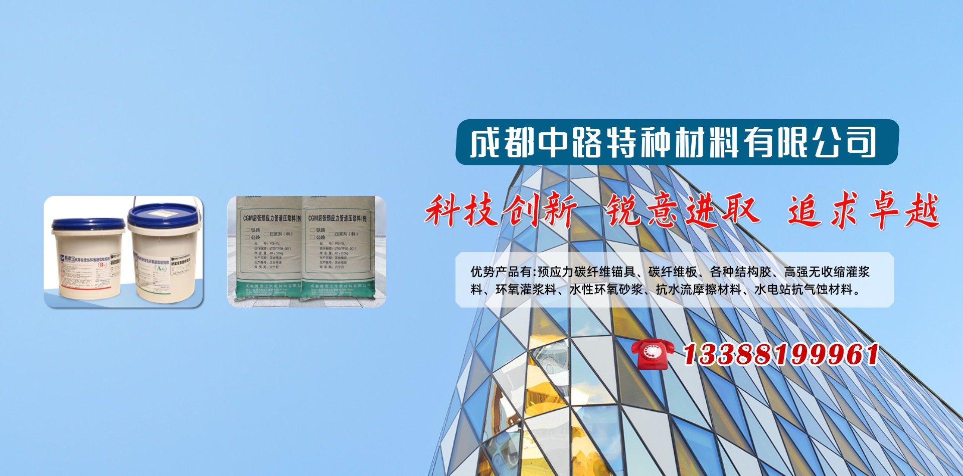成都中路特種材料有限公司借助清華大學(xué)高分子材料學(xué)科、晨光化工研究院、西南交通大學(xué)、四川交通職業(yè)技術(shù)學(xué)院科研技術(shù)平臺(tái)成為一家集新材料研發(fā)、銷售、技術(shù)服務(wù)和施工于一體的專業(yè)服務(wù)公司,優(yōu)勢產(chǎn)品有:預(yù)應(yīng)力碳纖維錨具、碳纖維板、各種結(jié)構(gòu)膠、高強(qiáng)無收縮灌漿料、環(huán)氧灌漿料、水性環(huán)氧砂漿、抗水流摩擦材料、水電站抗氣蝕材料和研發(fā)各種特殊用途膠黏劑產(chǎn)品地處西南腹地成都,業(yè)務(wù)覆蓋四川各大中小城市、重慶、云南、昆明、新疆、西藏等區(qū)域。產(chǎn)品涵蓋各種加固施工材料、施工設(shè)備及施工配件,品牌有威士邦等aa進(jìn)口品牌,同時(shí)批發(fā)銷售國產(chǎn)高、中、低端品牌,為客戶提供全面參考。 成都中路特種材料有限公司為您提供加固行業(yè)的一站式服務(wù)! 如果您面對(duì)建筑物加固,不知如何下手,我們將針對(duì)您的項(xiàng)目情況,提供全面的技術(shù)指導(dǎo)咨詢,甚至為您量身定做加固方案;如果您面對(duì)項(xiàng)目要求,不知如何購買加固材料,我們將根據(jù)您的需要,提供多種參考,從進(jìn)口品牌、國內(nèi)知名品牌到低端產(chǎn)品,一應(yīng)俱全; 如果你萬事俱備,不知何處尋找施工人員,我們可以為您提供具有多年加固經(jīng)驗(yàn)的專業(yè)隊(duì)伍;中路特種材料致力于為客戶提供全方位的建筑物加固解決方案。 成都中路特種材料有限公司是一座橋,一座連接廠家與用戶的橋,以質(zhì)量求生存,以信譽(yù)圖發(fā)展,成都中路特種材料有限公司期望用真摯的服務(wù)筑起一座客戶信任之橋。   科技創(chuàng)新 銳意進(jìn)取 追求卓越!        熱忱歡迎業(yè)內(nèi)專業(yè)人士加盟合作!